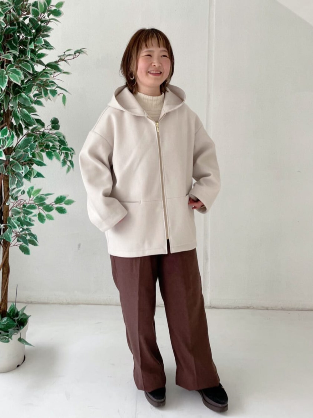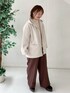 裏リブミディ丈フードコート。 《サイズ感》 厚手のカーディガンやニットの上に羽織っても窮屈感がなく着れます。 《着心地、素材感》 裏地は付いてないですが暖かく軽い着心地です。 ジャージー素材ですが上品さもあり、カジュアルになり過ぎずキレイめスタイルにも合います。 《おすすめポイント》 コクーンシルエットが可愛らしく、お尻が隠れるミディ丈でパンツにもスカートにも合わせやすいです。