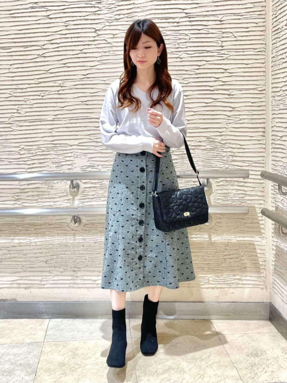 《スタイリングポイント》 グレー×ブラックの組み合わせで、落ち着いた雰囲気のコーディネートにしてみました。 《サイズ感》 ニット:ゆったり着れて、Vネックが首周りをスッキリみせてくれます。 スカート:身長158cmで膝下くらいの丈感でした。 低身長の方にもオススメのサイズ感です。 《おすすめポイント》 ニット:シンプルなデザインなので、カジュアルからキレイめまで幅広く使えるアイテムです。 スカート:大きめのフロントボタンがコーディネートのアクセントになります♪