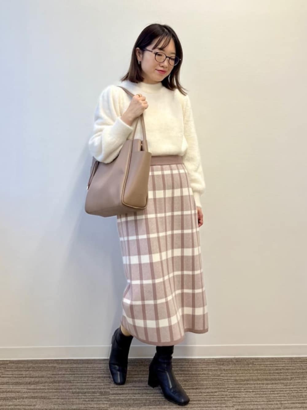 ⭐︎ニットセットアップの着回しコーデ⭐︎ スカートを着回しました! 【トップス】 まるでぬいぐるみみたいなふわふわニット。 肌ざわりよく着心地が良いです。 パフスリーブでフェミニンな印象に。 フリーサイズで窮屈感なく、ちょうどよく着られました。 【スカート】※セットアップアイテム トップスはシンプルなものを合わせて、大きめなチェック柄を主役に。 ウエストゴムですがインスタイルもきれいに決まります。 足首上くらいの丈感でした。