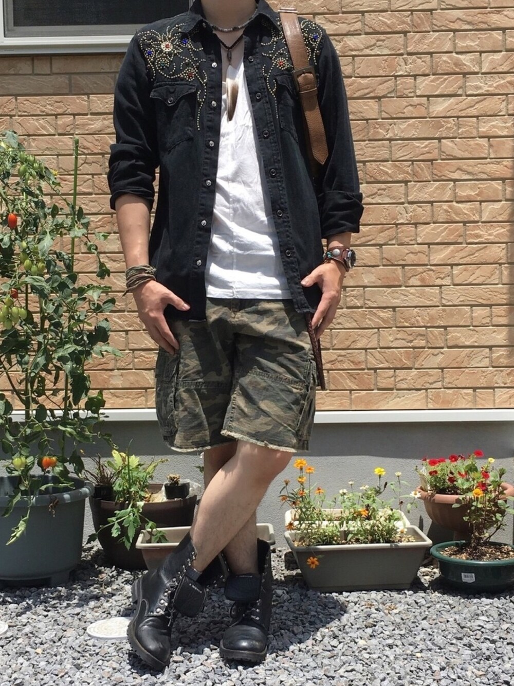 今日のコーデです! bonds&peace VネックTシャツ サイズ3 リップストップカモショーツ サイズ30 パラシュートコンバットブーツ サイズL27.5 RRL スタッズシャツ KETO ウエストバッグ