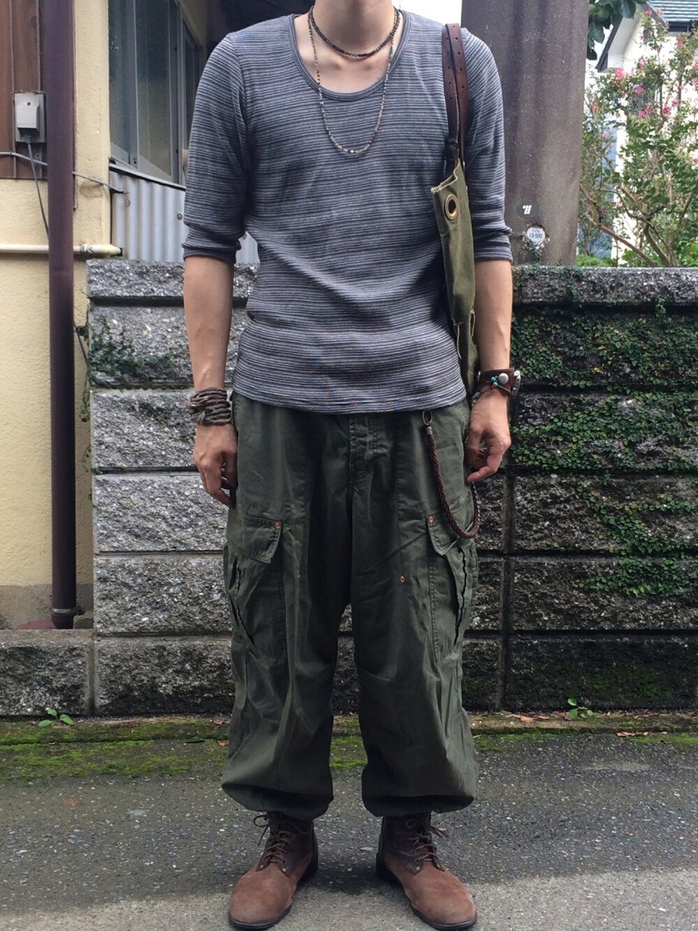 ワイドカーゴを使用してAラインを意識したコーデです^ ^ bonds&peace フライスボーダー七分袖T サイズ2 ワイドカーゴ サイズ28 プレーントゥブーツ サイズL27.5 トートバック シェルターコイズネックレス ラップブレス ネイティブレザーウォッチブレス