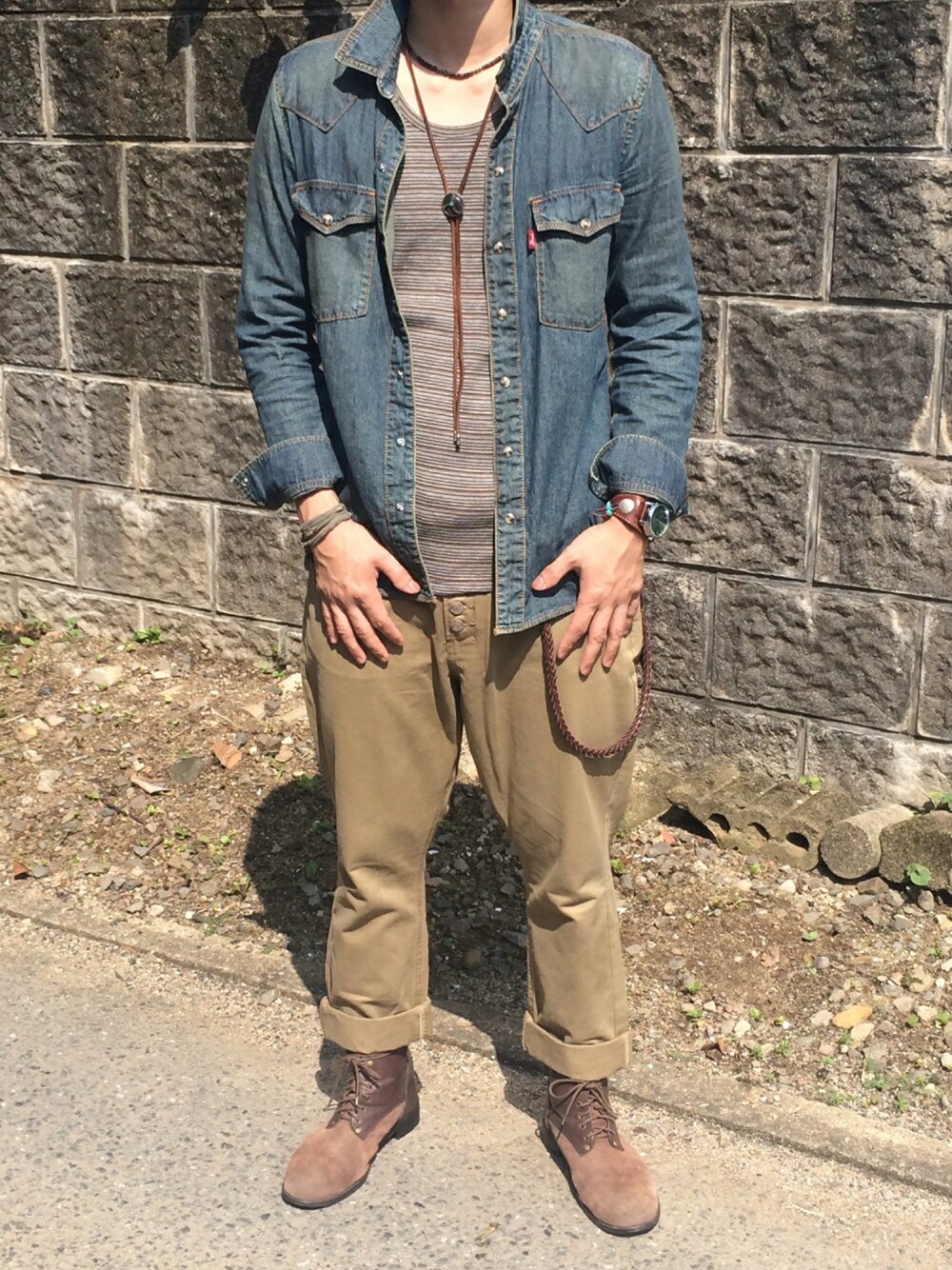 全身bonds&peaceで王道アメカジコーデです^ ^ デニムシャツ サイズ2。 フライスボーダー サイズ3。 サルエルチノ サイズ30。 プレーントゥブーツ サイズL27.5。 アクセ シェルターコイズネックレス。 ループタイ。 ネイティブレザーウォッチブレス。 ラップブレス。 レザーロープ ベルトホルダー。