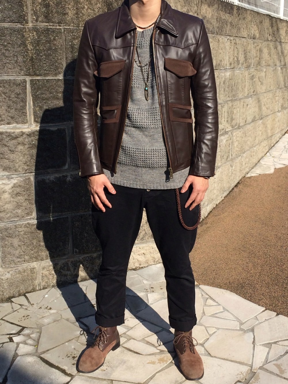 今日のコーデ^ ^ bonds&peace FANGレザージャケット サイズ2 編みたてボーダーニット サイズL サルエルチノ サイズ28 プレーントゥブーツ サイズL27.5