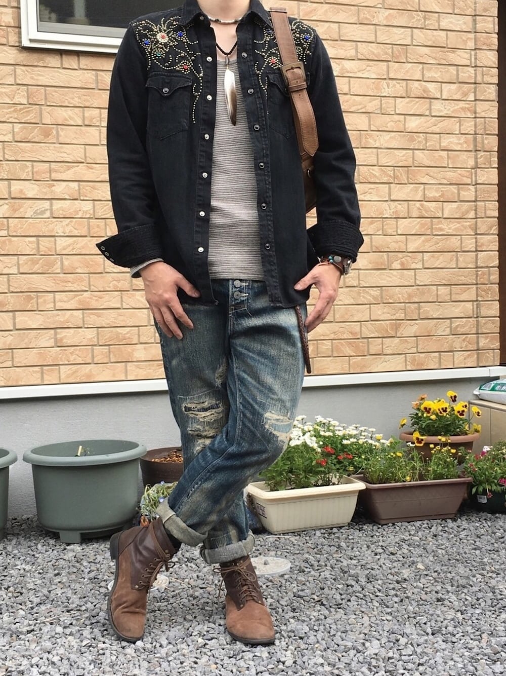 久しぶりの投稿です! 今日のコーデです! 引地くん私物 RRLスタッズシャツ サイズM Bonds&Peace フライスボーダーロンT サイズ3 サルエルデニム サイズ30 プレーントゥブーツ サイズL27.5 アクセ pace、Bonds&Peace、KinCrossWorld