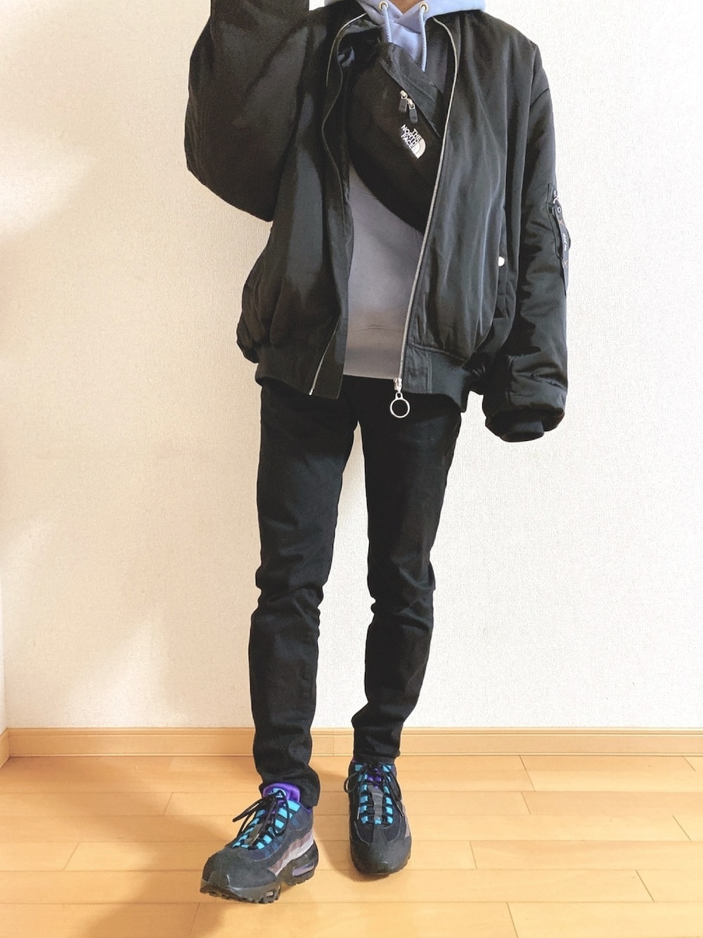 MAー1✖️黒スキニー ブラックコーデに仕上げました◼ MAー1とパーカーのフードがマッチしてます❗ 前回も沢山のハート&お気に入りありがとうございました🙌