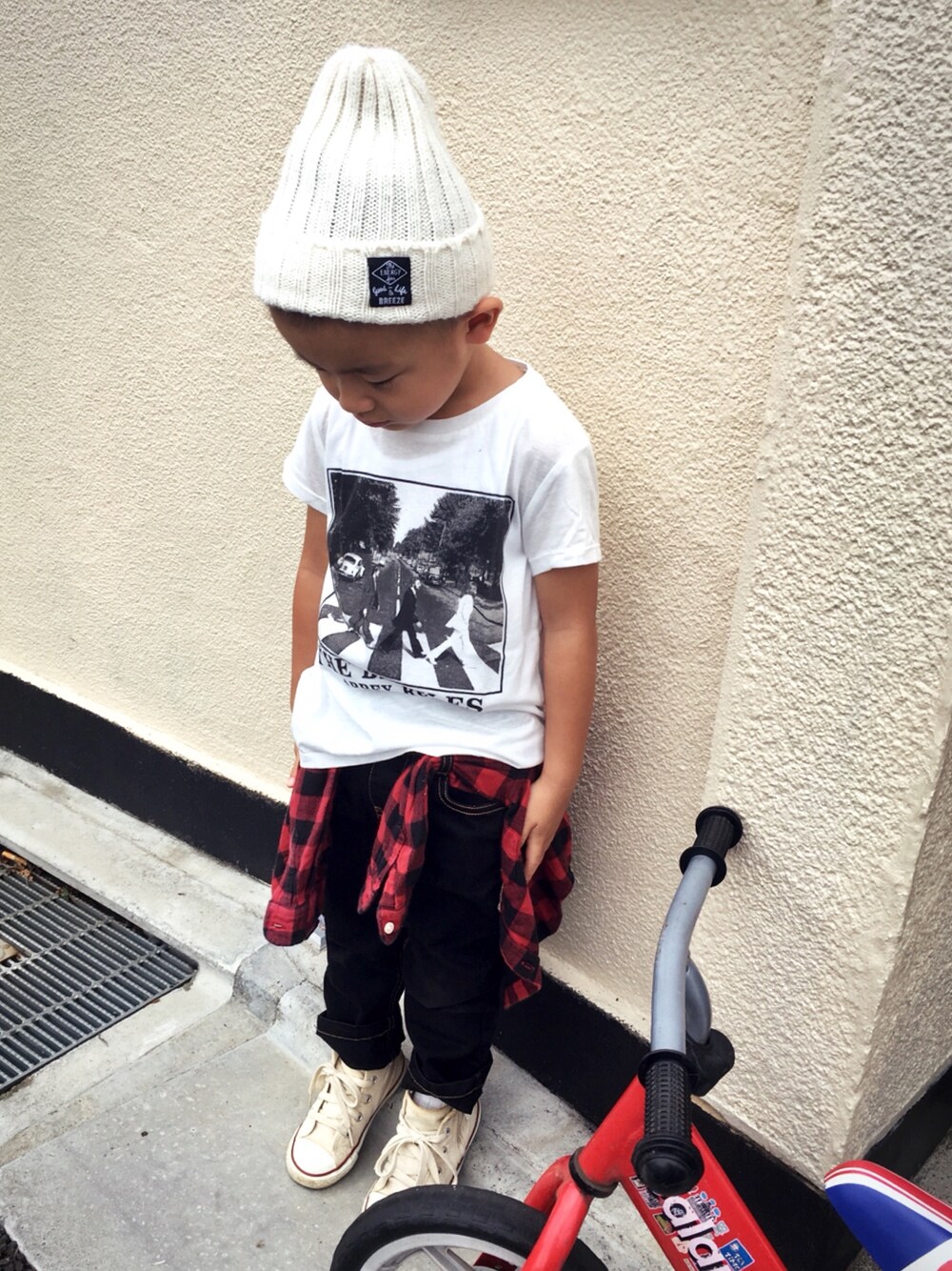 いつか子供が産まれたら着せたいと買っておいたビートルズtee! 5年ほど保管しておいたものがやっと!ひのめをみた!!! という個人的に嬉しいコーデです😊 おズボンのベルト通しにシャツの袖を通すと、腰巻きがルーズな感じに仕上がってよいですね、サイズアウトしたシャツとっておといてよかった〜腰巻き専用でとっておこう