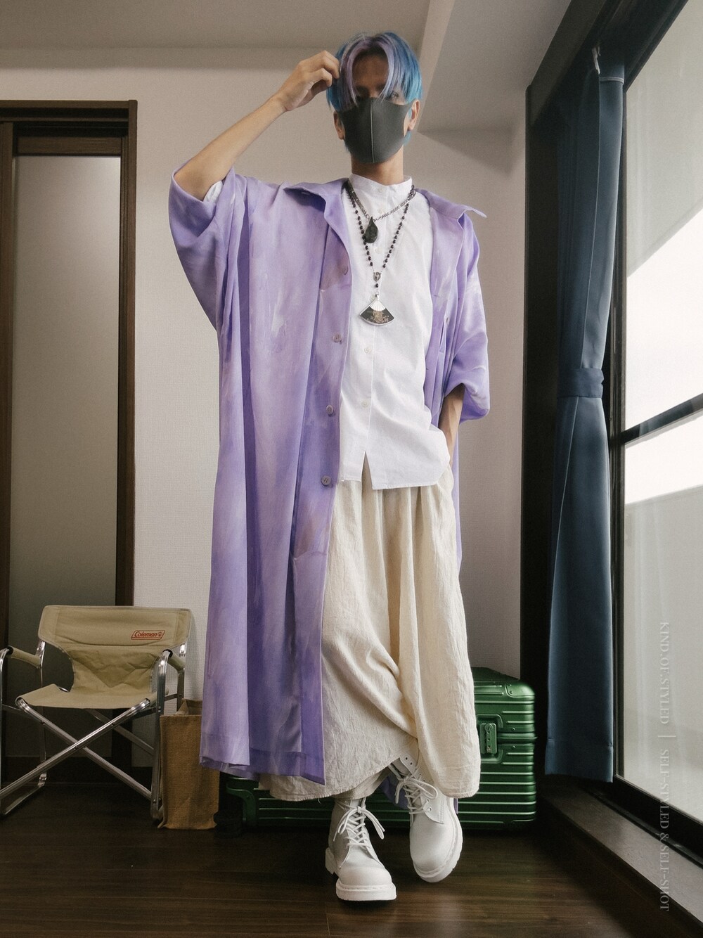 透ける紫のローブを中心に、タイのローカルマーケットで見つけた麻布のスカートと白ブーツでシルエットを構成