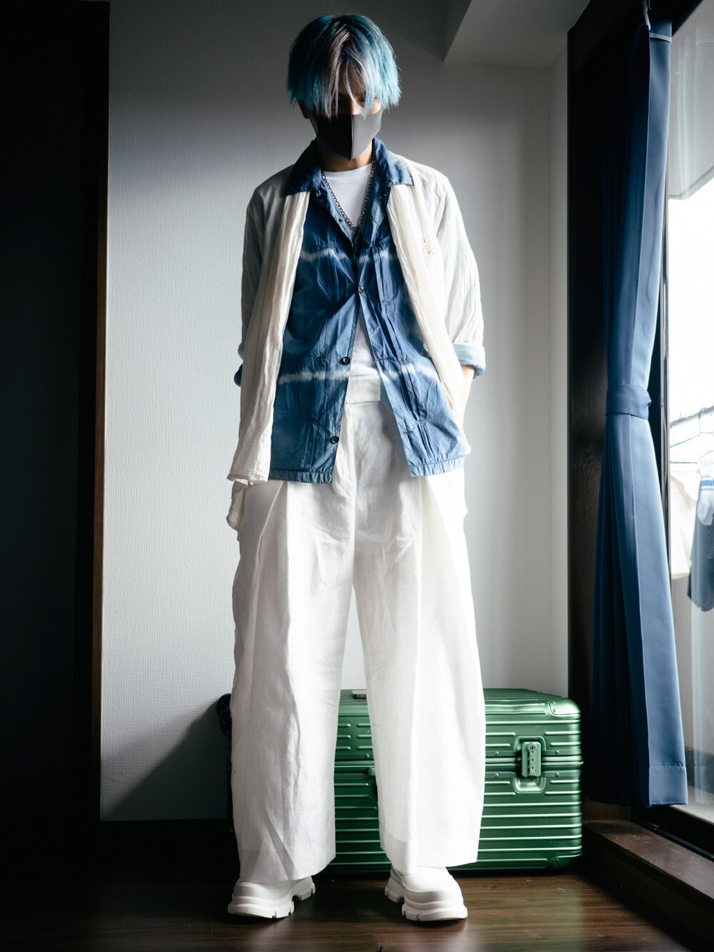 白のワイドパンツと厚底ブーツをベースに、藍染め風シャツとノーカラージャケットをレイヤードし、髪色とリンクしたブルーの差し色で統一感を演出