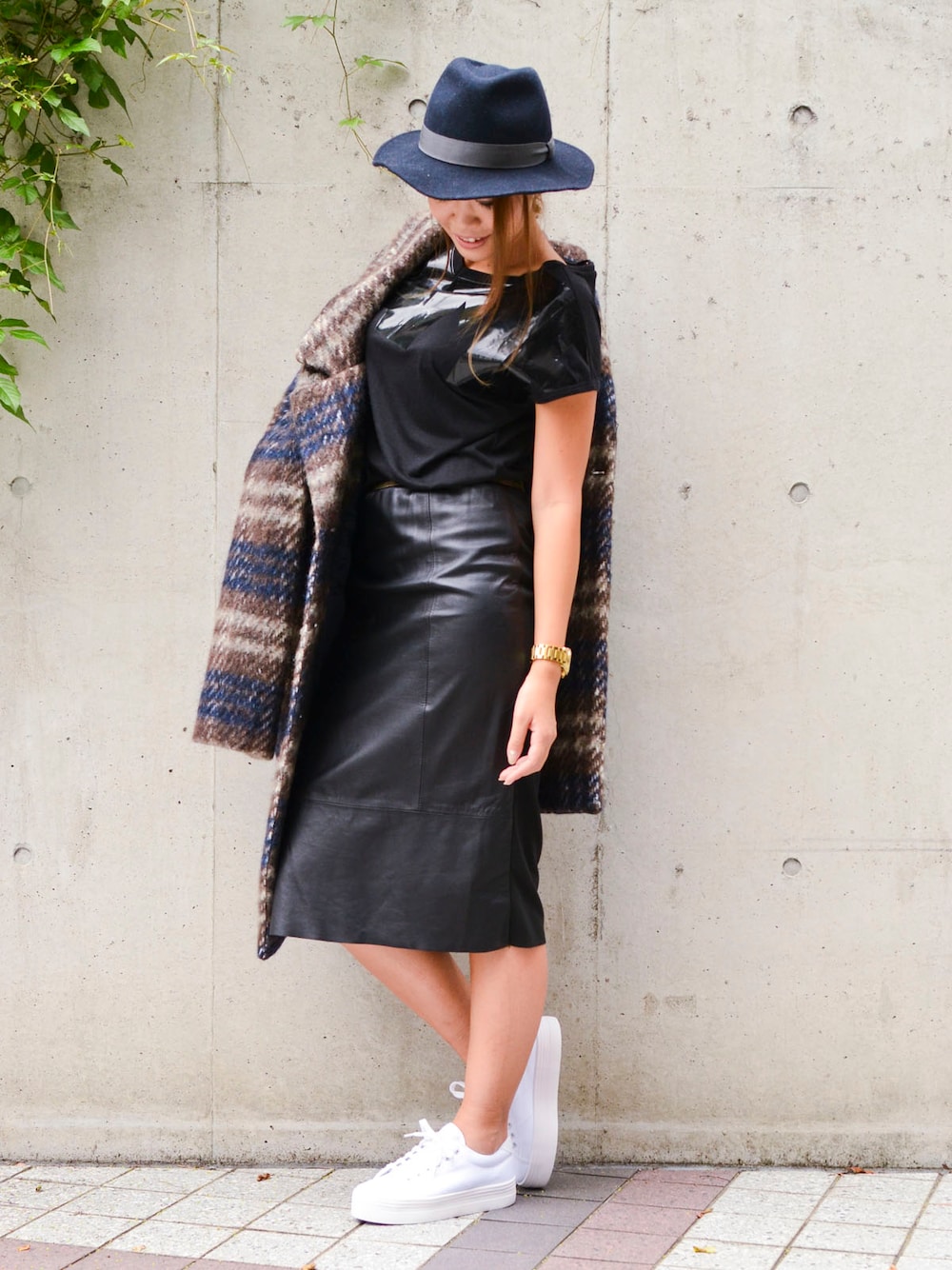 シンプルなブラックを基調としたスタイルにシーズンムードを盛り上げてくれるアウターをON! トップスはカジュアルな雰囲気ですが胸部分までのデザインがかっこよく魅せてくれるのでボトムで印象も変わります。 スカートな長めの着丈のレザースカート。 ストレッチが効いているので動きやすく履きやすいのが嬉しいポイントに☆ カチっとしすぎないスタイリングにヒールではなくシューズを合わせることによってラフ感もプラス! これからの季節にピッタリなコーディネートです★