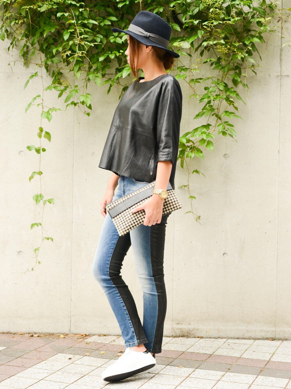 ALLレザーのトップスにデニムでクールなスタイリング☆ トップスは柔かい生地感で動きやすさ◎、デザイン性も◎なアイテム!! 存在感のある1枚です♡ デニムはストレッチが効いているのでこちらも動きやすい1枚★ 他と差がつく大人カジュアルコーディネート!! 足元は履きやすさ◎なスニーカー!!ホワイトの色味が明るい雰囲気をプラスします♡ クラッチバックでこなれ感も★