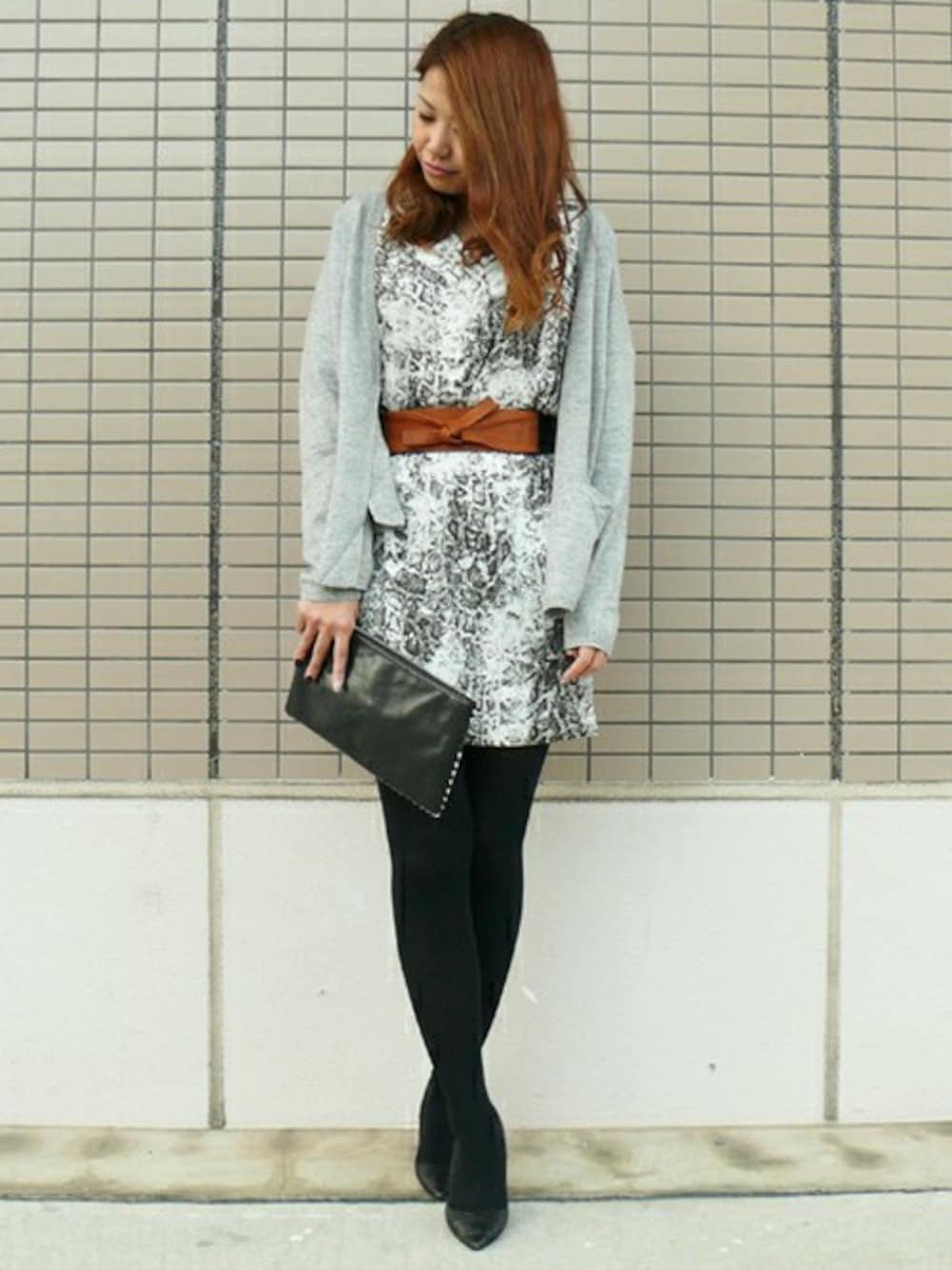 パイソン柄が印象的なワンピースコーディネート♡ 柄が強くないので爽やかな印象に! 1枚でスタイルが決まります♡ ウエストはベルトでマークしてスタイルアップ! 足元をヒールで合わせることでカジュアルになりすぎない着こなしに★