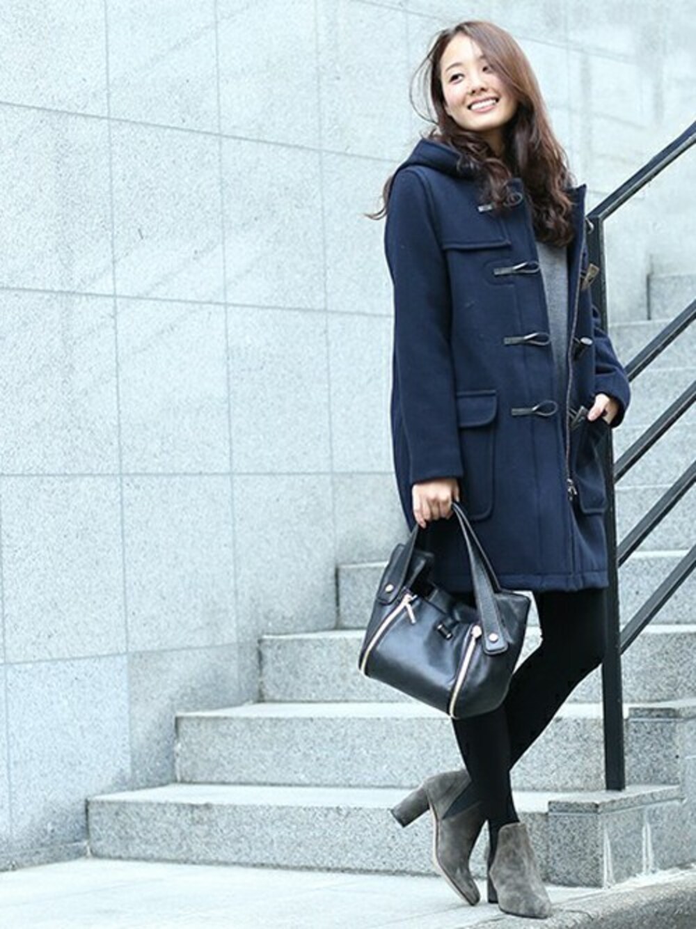 コクーンシルエットのきれいめダッフルコートでつくる大人カジュアルコーデ。