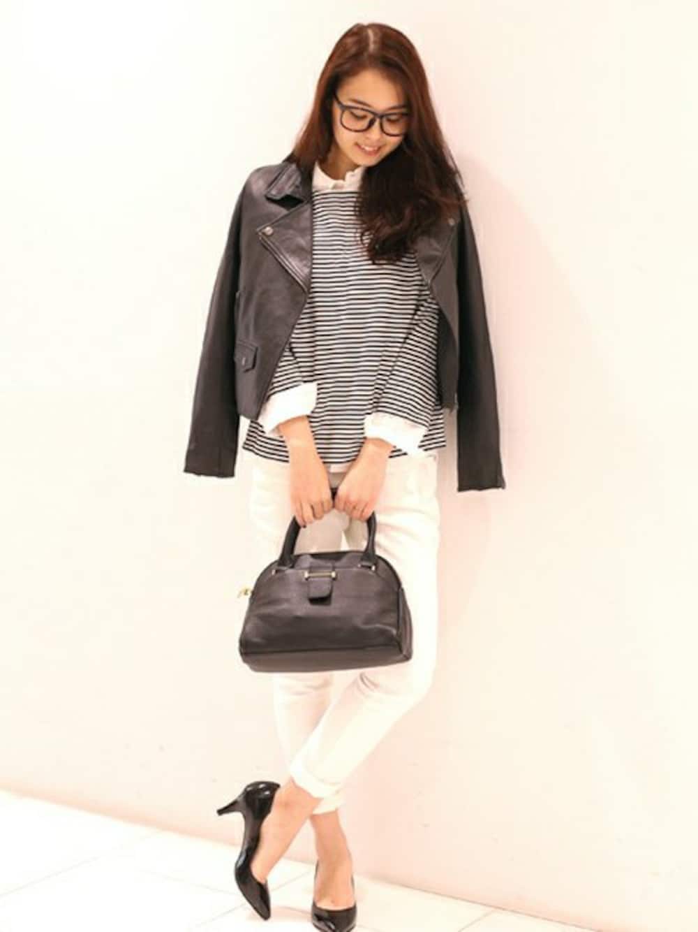 カジュアルになりがちなボーダートップスもシャツとレイヤードしてモノトーンでスタイリングすればこなれた印象に。
