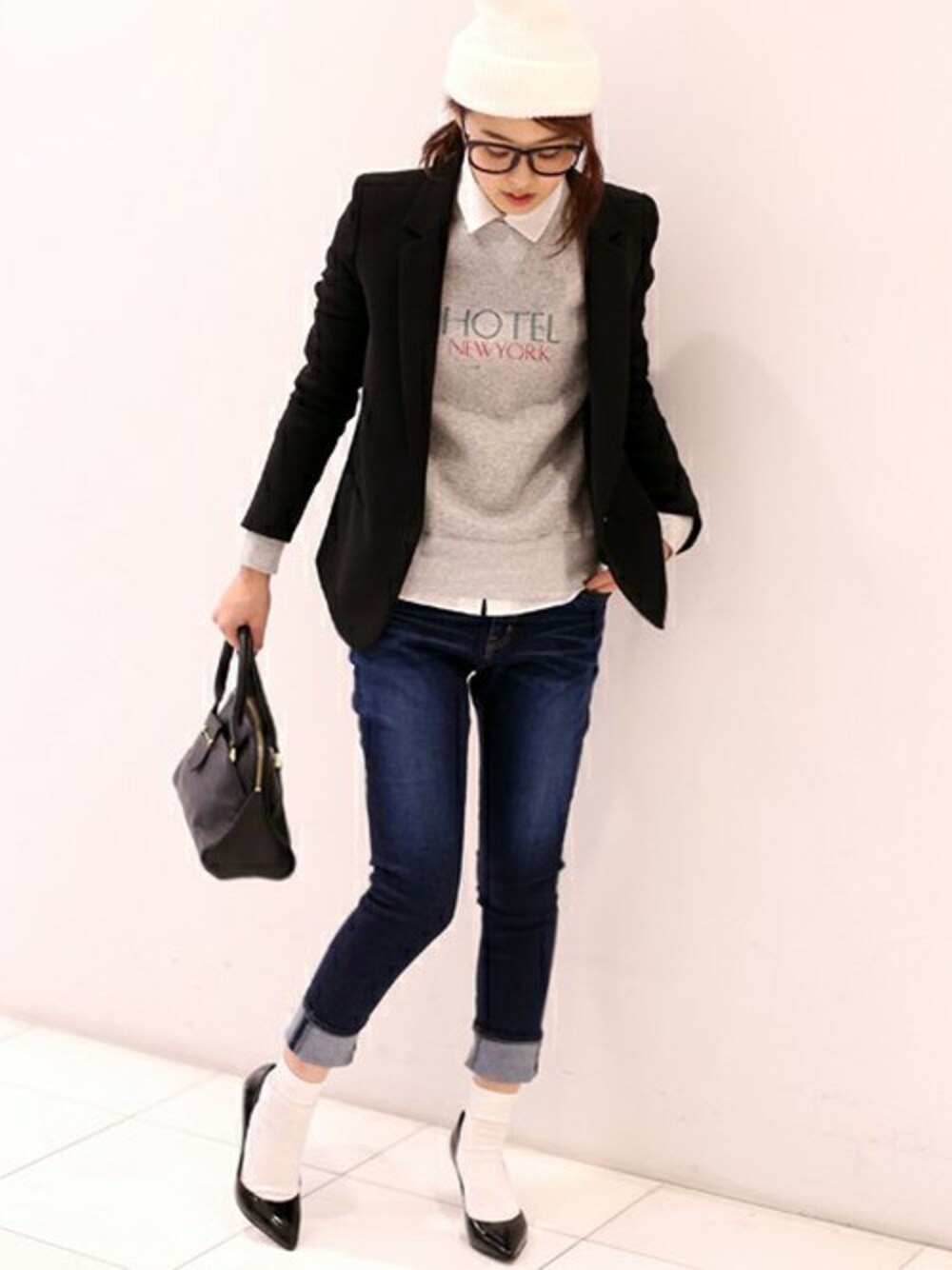 ロゴスウェットにデニムのカジュアルスタイルにジャケットを合わせてスタイリング。 スキニーデニム×白ソックス×ヒールパンプスは今季イチオシのゴールデンコンビ!