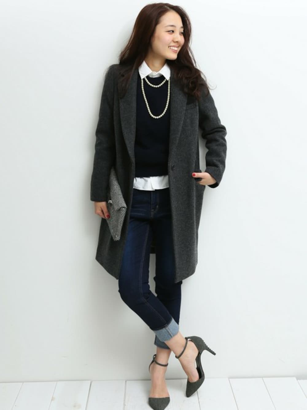 人気ナンバー1のロングチェスターコートはデニムと合わせてカジュアルダウンした着こなしもオススメです。 ピンヒールとパールネックレスにクラッチで大人な印象に。