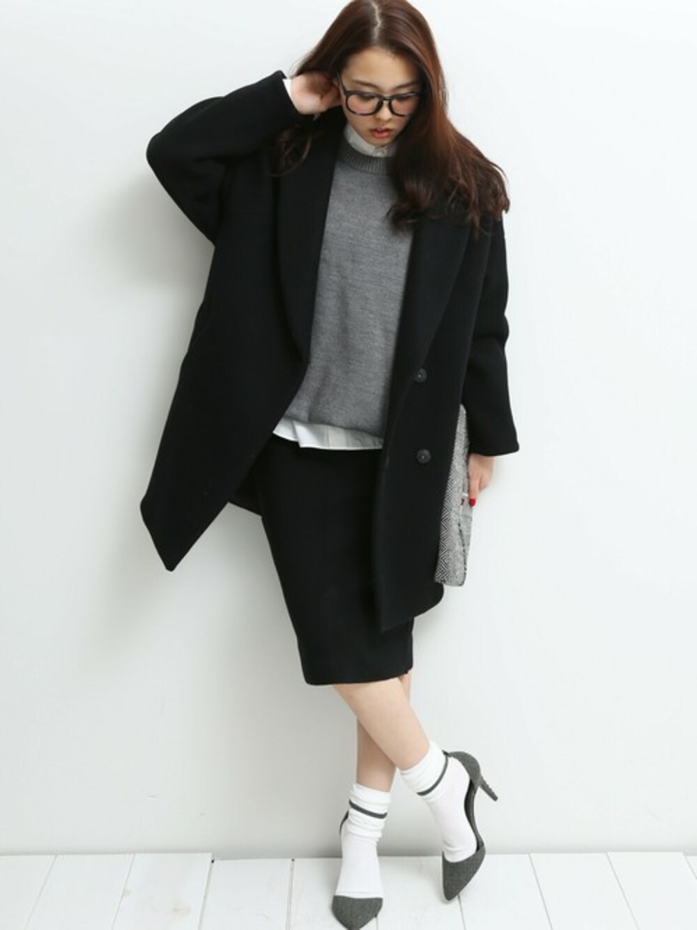オーバーサイズのコクーンコートはインナーをコンパクトにまとめて着こなせばスッキリとした印象になります。 モノトーンで色味を抑えて大人な雰囲気に。