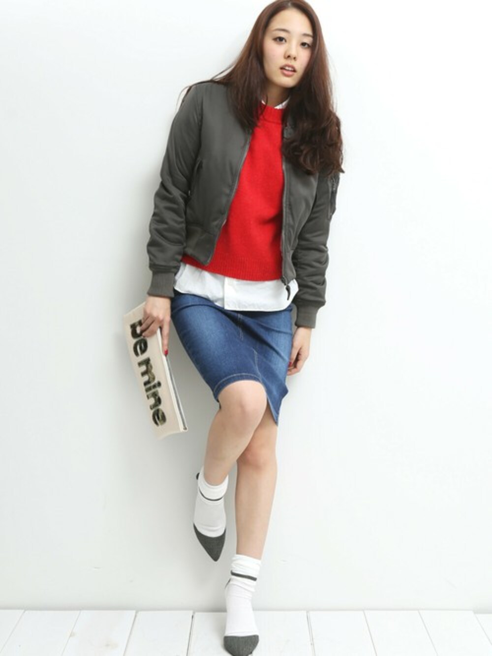 キブンが落ち込みがちな寒い日は真っ赤なニットで元気に出社しましょう! 赤のニットはトレンドのMA-1との相性バツグンです。