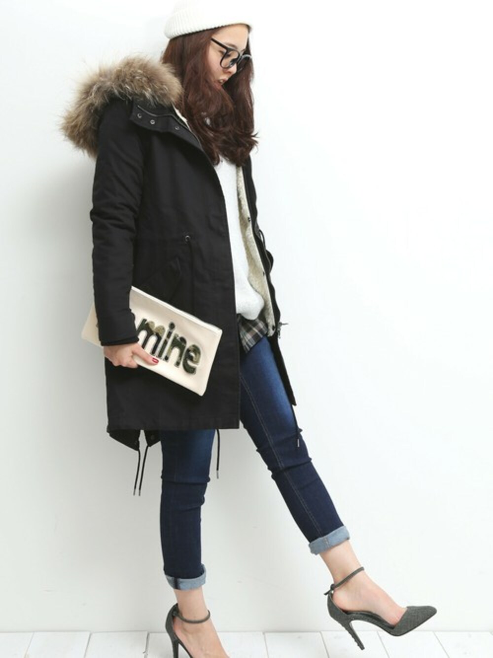 贅沢なファー使いのモッズコートをデニムでカジュアルにスタイリング。 華奢なヒールで合わせれば女性らしい印象に。