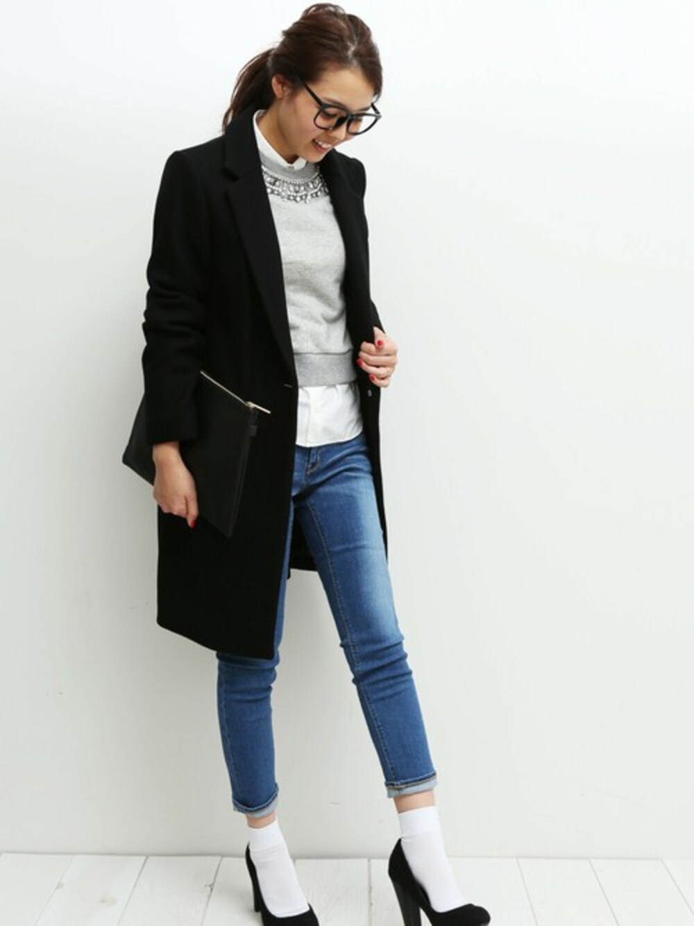 ビジュースウェットとデニムのカジュアルコーデを大人気のロングチェスターで引き締めたスタイリング。