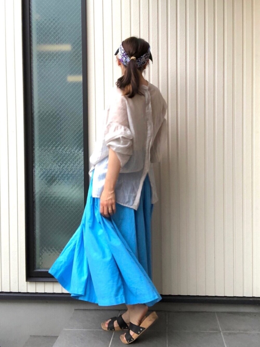 覚書🖋 夏の空みたいなスカート! 梅雨真っ盛りだけど、キレイな色の服見るとちょっとスッキリするー。 緊急事態宣言中のお弁当頑張ったで賞 で買ってもらった。 頑張って良かった。 ミスティックのシャツは案外ボタン後ろで着るのが好き。