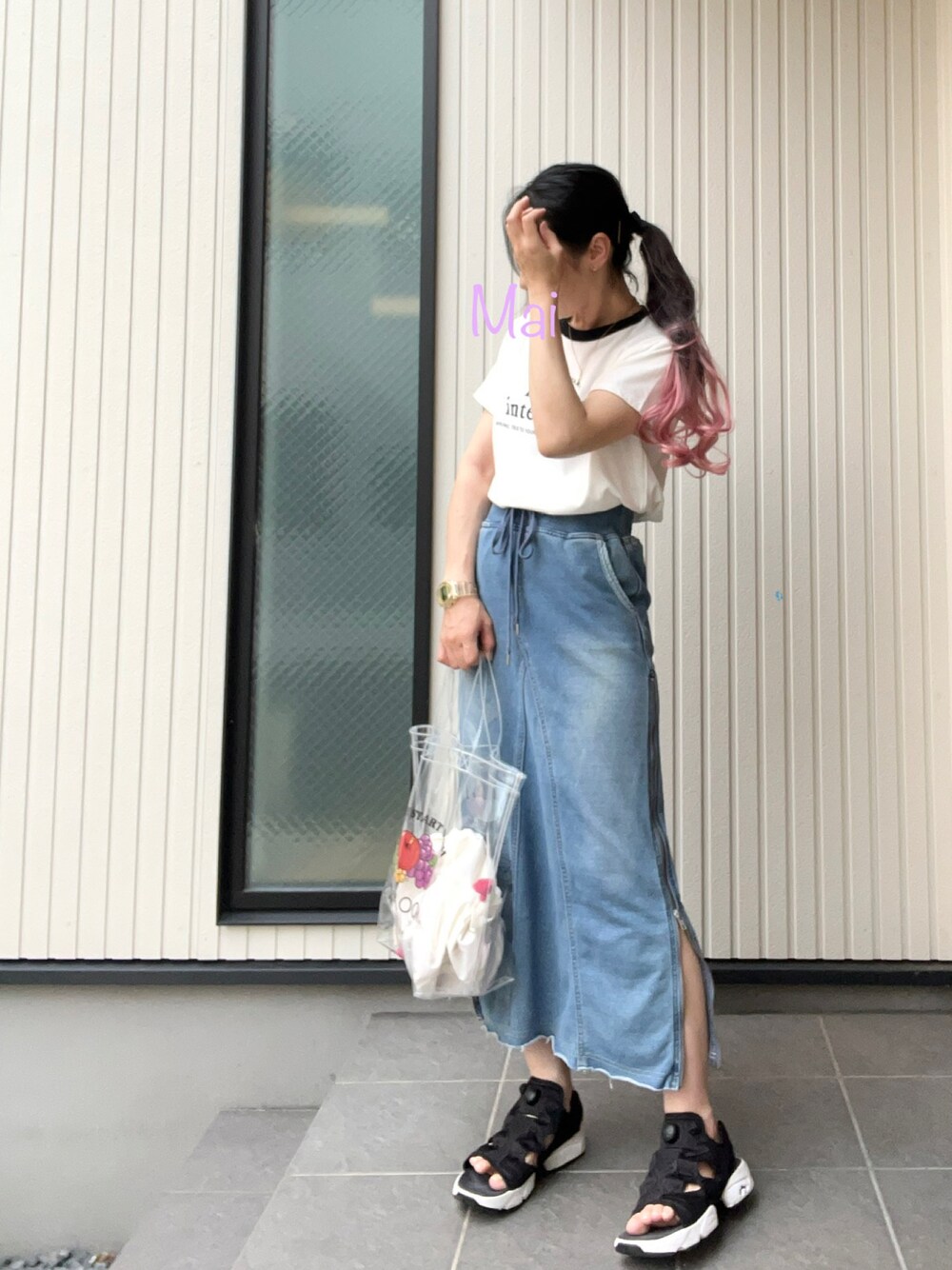 覚書🖋 あるもので着回し👕 デニムと白Tは永遠の定番。 あ、 髪の毛は100均で200円で買いました👛