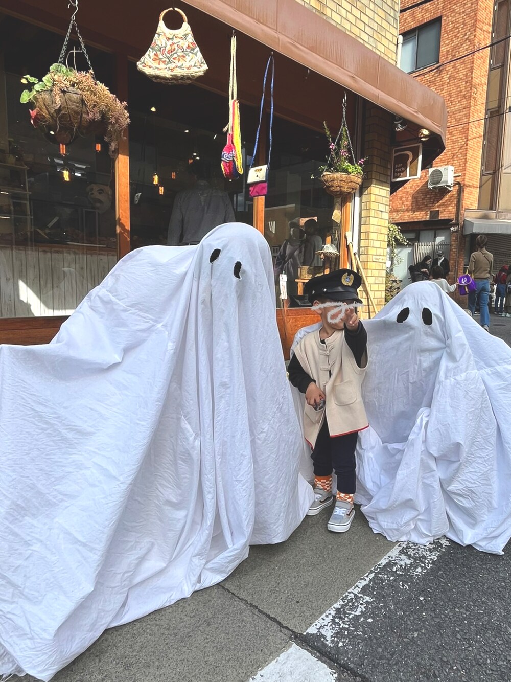 覚書🖋 買い物に行った商店街でハロウィンやってて、オバケさんと記念撮影👻 アオさんの車掌帽はコスプレでなくガチ勢です🚃 「おばけさんすきー」だそうです。