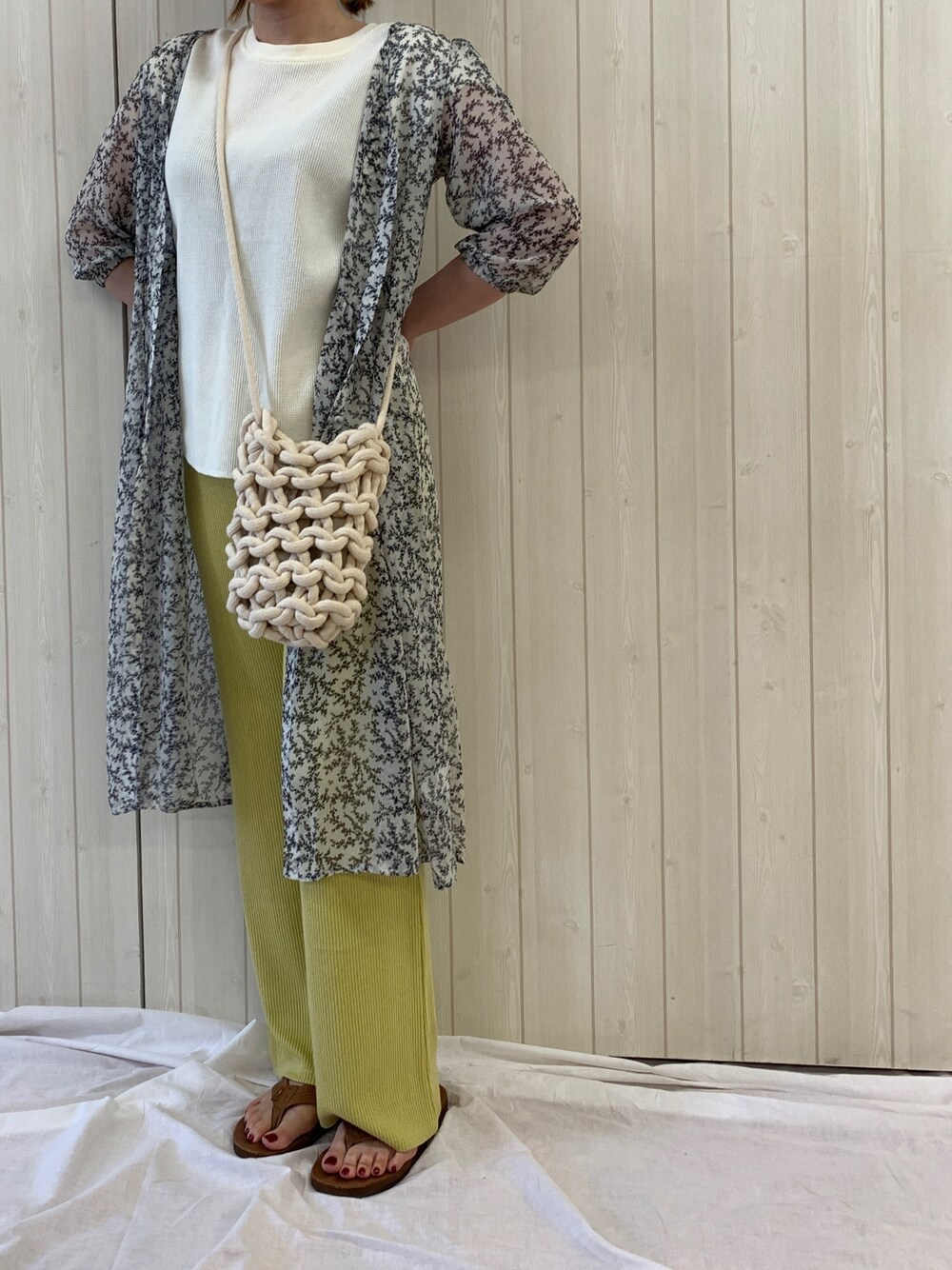 透け感のある花柄ワンピースを主役に、イエローのリブパンツで爽やかにコーディネートしました。コットンロープバッグをアクセントに。