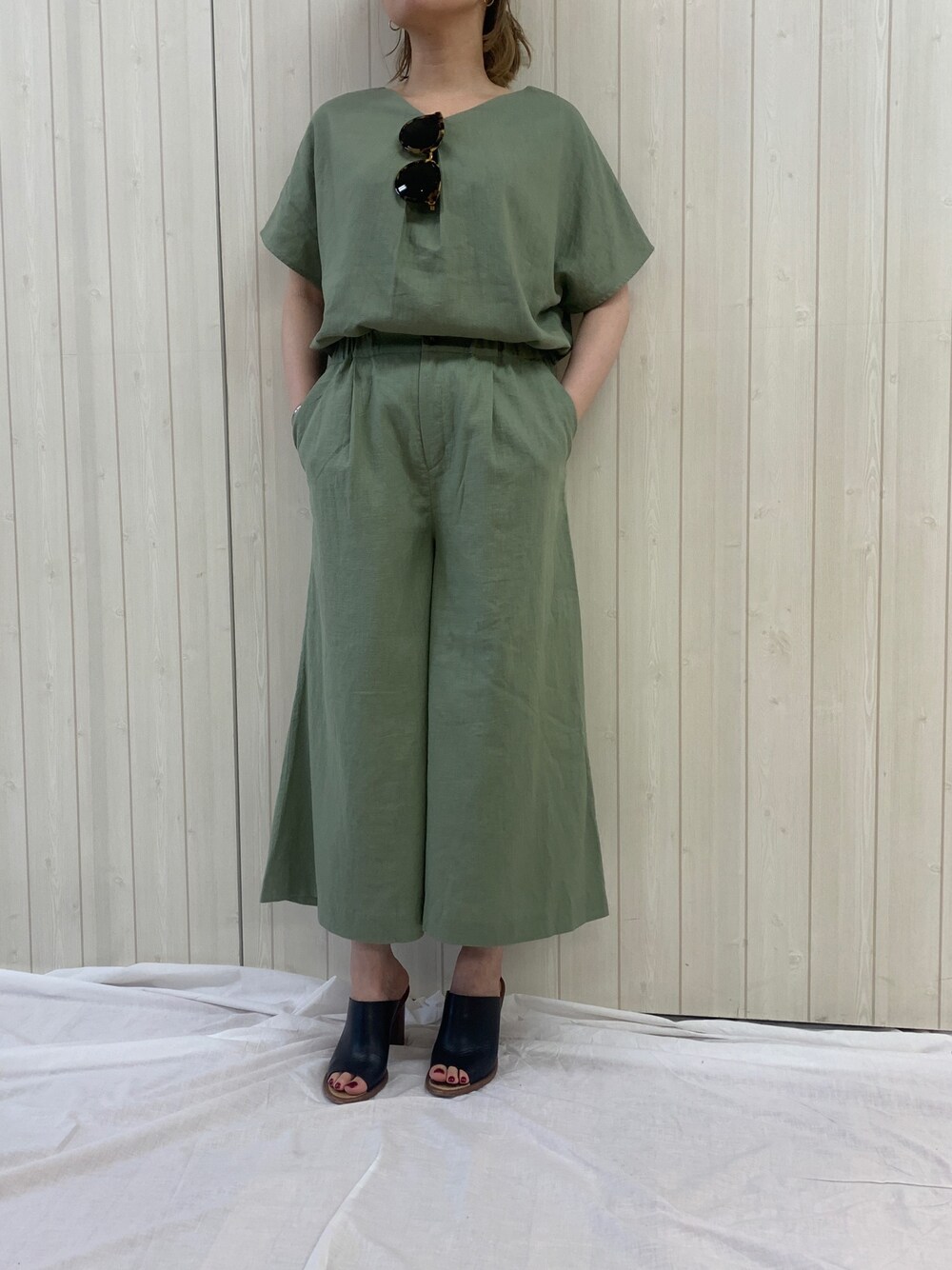 ウォッシャブルリネンレーヨン素材のイージーセットアップ。ヒールのある靴やシルバーアクセで引き締めてみました。
