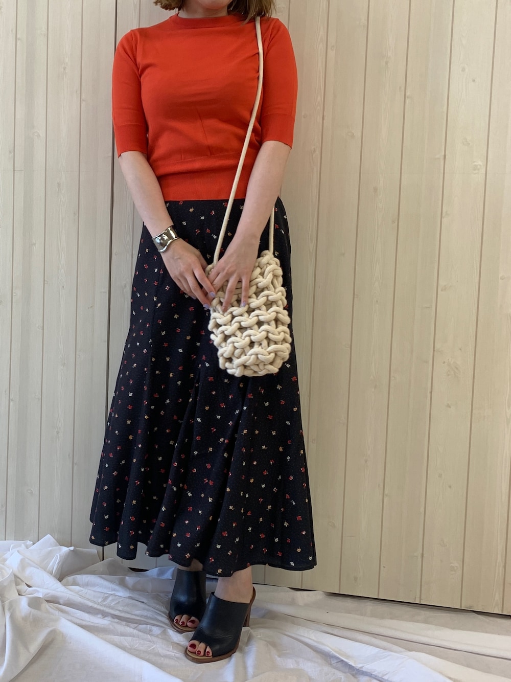 ガーリーな花柄スカートもパキッとしたオレンジと合わせればいつもと違う印象に。