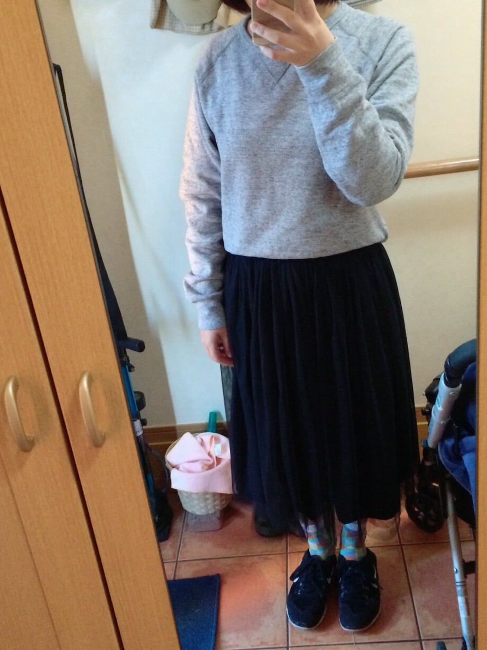 グレー系のスウェット、ブラック系のスカートを着用したレディースの冬コーディネートの1枚目の写真