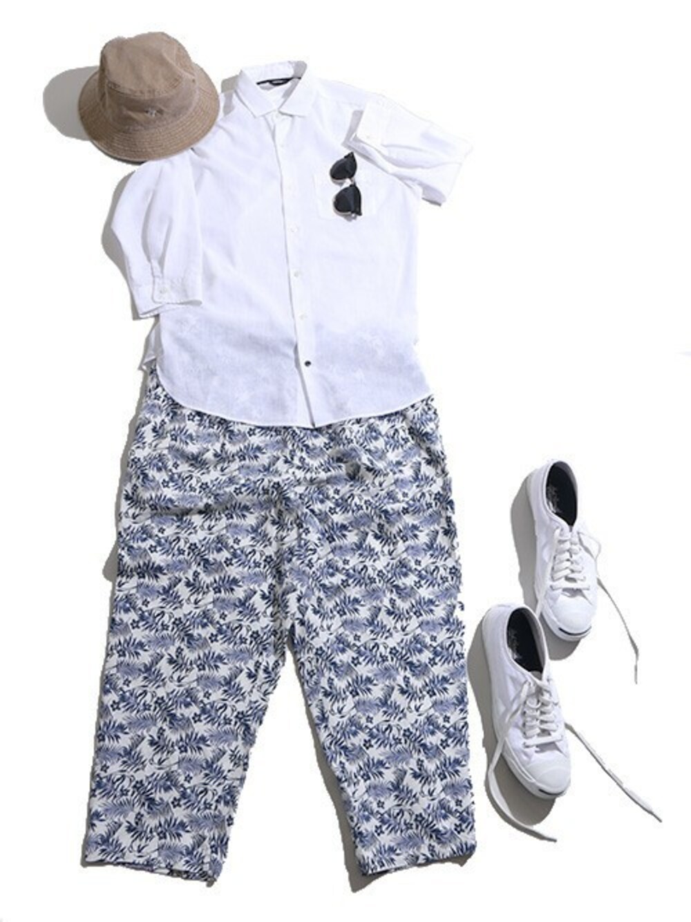 リネンパターンパンツを使ったホワイトベースコーデ。シャツもリネン地を使うことによって夏らしさがさらに増します。 シャツ、スニーカーはホワイトをチョイスすることによって柄パンツともまとまりが出ます◎ 帽子はバケットハットのベージュで着こなしのアクセントに。皆さんもこの暑い夏、ラフなスタイルで柄コーデに挑戦してみてください!