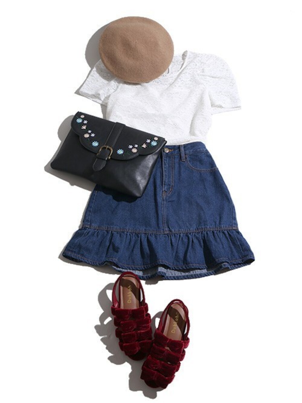 今回は【フリルミニスカート】を使ったコーデをご紹介! カジュアルになりがちなデニムも、裾部分に施されたフリルのデザインがフェミニンな印象を演出♪ トップスの総レースのカットソーが、女性らしく上品に見せてくれるので、ミニスカートでも大人っぽく着こなせます◎ ベレー帽やベロア素材など、今からでも取り入れられる秋物アイテムで一足先に秋を意識★ 是非、この機会にチェックしてみて下さい!
