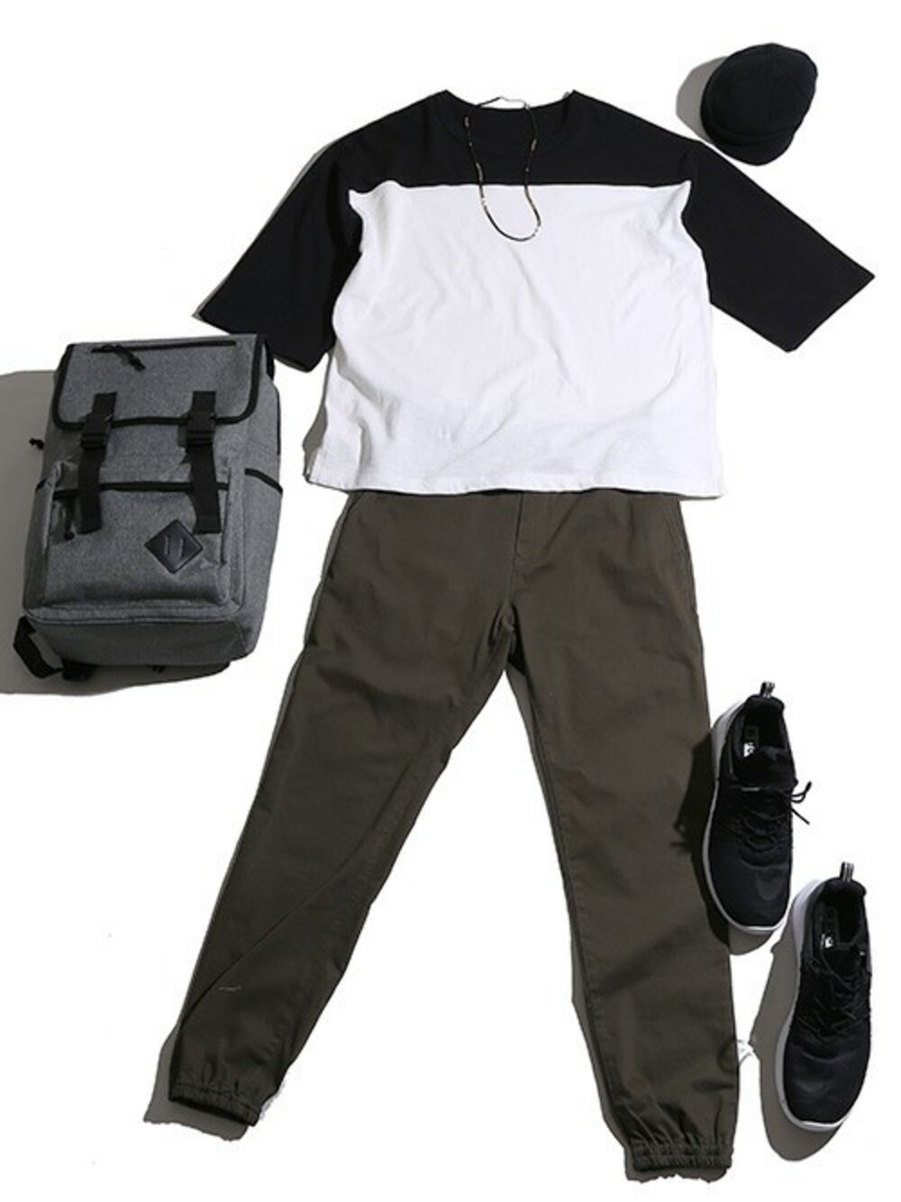 厚手のスラブ生地を使用したフットボールTシャツを主役にした、ストリートコーディネート◎パンツにはストレッチが抜群に効いたジョガーパンツをチョイスしました。 サークルストレッチという360°全方向に良く伸びる新開発素材を使用しているので、今までにはない快適な履き心地が魅力の一本です。足元にはハイテクスニーカーを合わせ、スポーツテイストも盛り込みました! 小物にバックパックとニットキャップを合わせて、よりストリートライクに仕上げました。レジャーシーンやタウンユース、どちらにも対応可能な万能スタイルです◎