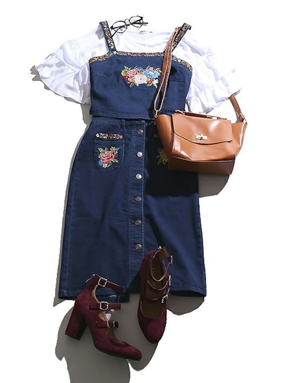 本日はインナーを変えればアレンジが広がる、デニムセットアップ風コーディネートをご紹介◎ フロントに施された大胆なフラワー刺繍がフェミニンさと上品な雰囲気を醸し出します。 それぞれ別々で着用頂けるので、お持ちのボトムスやトップス、これからの季節だとニットやシャツなど、応用が利く便利なアイテムです★ 単色仕様のショルダーバッグはなんと\2,149!!オススメです◎ 是非、この機会にチェックしてみて下さい!!!