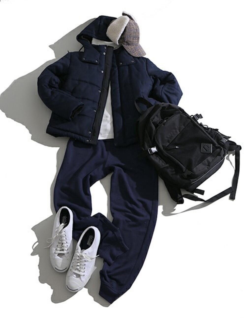 全体をネイビーでまとめた、冬のカジュアルコーディネート。アウターはウールライクな素材感と高い保温性が魅力の中綿ジャケットをチョイス◎ ボトムスにはスポーティなジョガーパンツを合わせ、動きやすくもタウンユースにぴったりなスタイリングに仕上げました!インナーとシューズには差し色として爽やかな印象のホワイトカラーを選ぶことで、全体を暗すぎない印象に。 真冬の寒さにも対応可能なカジュアルスポーティスタイル。皆さんも是非真似してみて下さい!