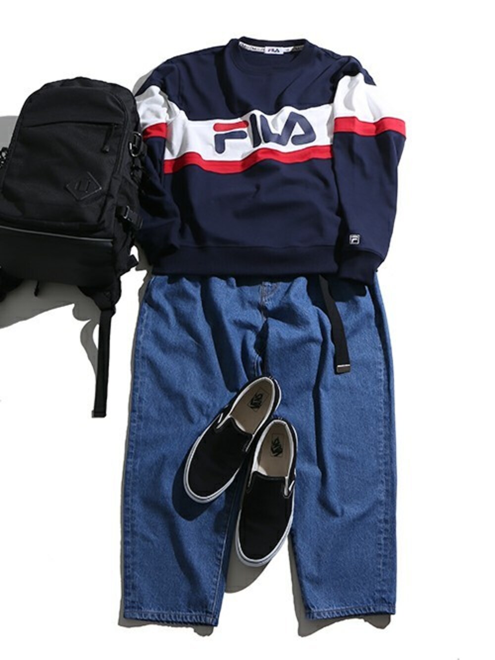 大人気スポーツブランド"FILA"とコラボしたスウェットを主役にした、ストリートコーディネート◎ ボトムスには今季のトレンドでもあるワイドなデニムパンツを合わせ、90'sテイスト溢れる雰囲気に仕上げました。 トップスとボトムスどちらもゆったりとしたサイズ感を選ぶと、今らしい着こなしになるので是非オススメですよ!