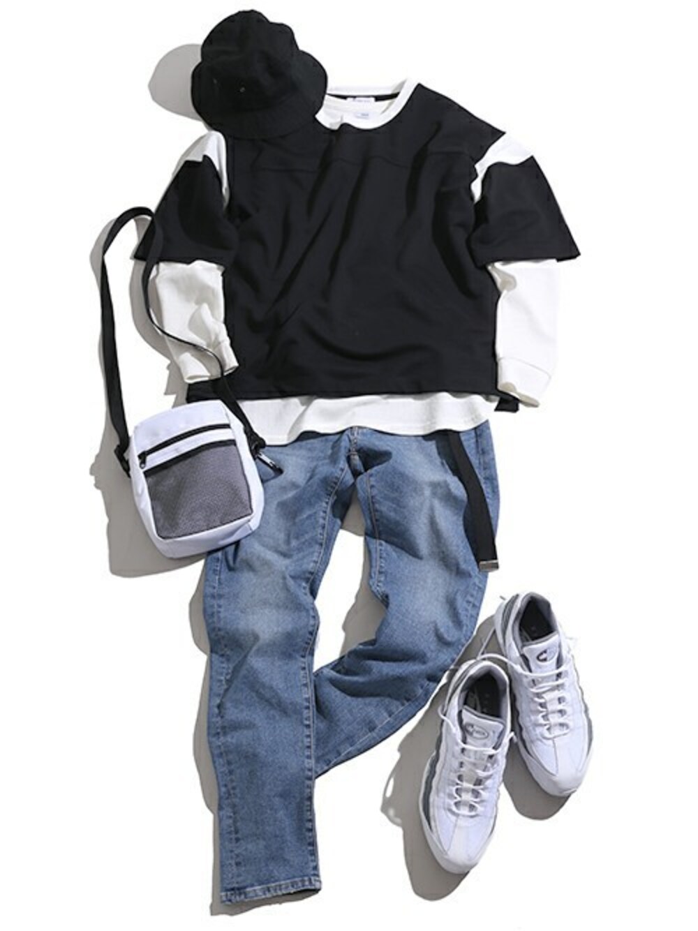 フットボールTシャツを主役にした、ストリートカジュアルスタイル◎ ボトムスにはタイトな作りが綺麗なスキニーデニムを合わせ、Vラインシルエットを意識した仕上がりに。 バケットハットとサコッシュで更にストリート感を強めています!