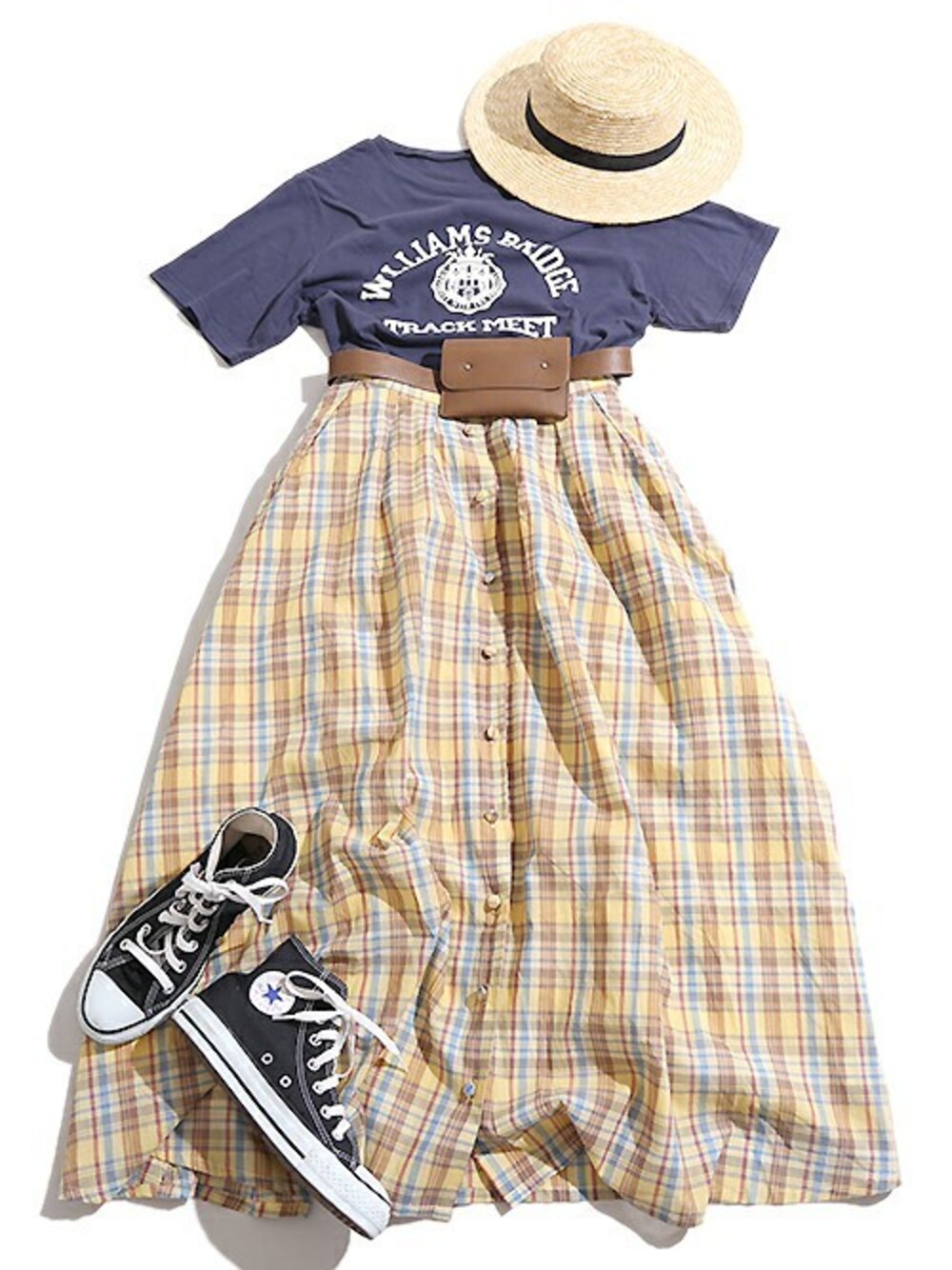 本日は、【マドラスチェックロングスカート】を使ったコーデをご紹介致します! 今季注目のマドラスチェック。鮮やかなイエローがこれからの季節にピッタリ★ 1枚で主役級なチェックスカートには、落ち着いたネイビーを合わせてバランス良く◎ プリントされたヴィンテージ風のカレッジロゴデザインが、コーデに親しみやすいカジュアル感をプラス! ポーチ付ベルトでウエストマークすることでスタイルUP効果も期待! 足元はスニーカーで外すことで今季らしい着こなしに♪ ぜひ、チェックしてみてください!