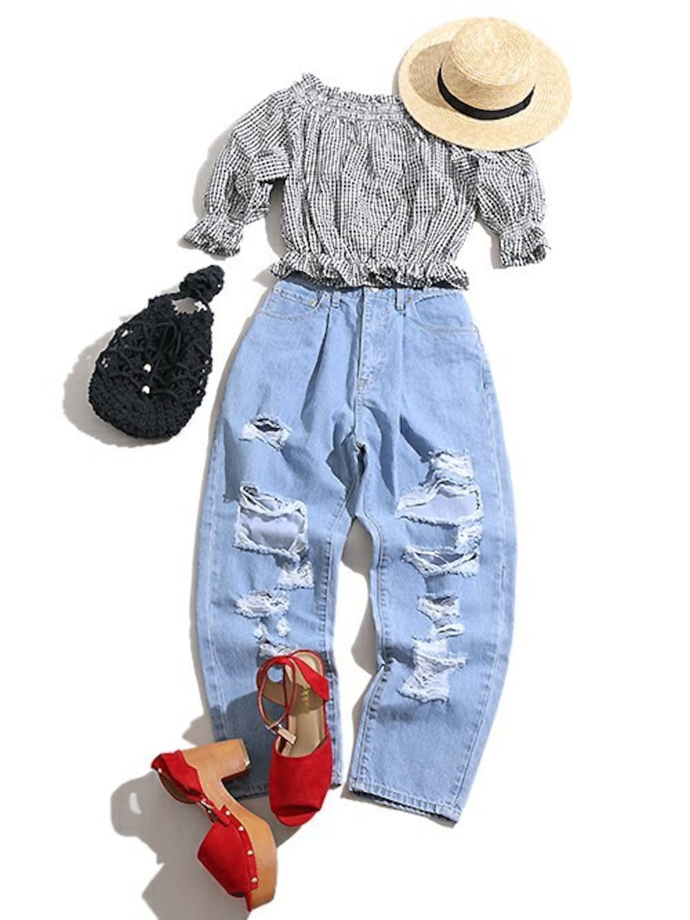 本日は【クラッシュタックマムハイウエストデニムパンツ】を使ったコーデをご紹介します。 大胆なクラッシュ加工が注目度UP! 裾に向かってスッキリとしたシルエットのためスタイルアップ効果も期待できるのも嬉しいポイント♪ 今回はトップスにギンガムチェックのオフショルを合わせフェミニンな印象に◎ シンプルなトップスにも相性抜群なクラッシュデニムはこれからの季節に活躍すること間違いなし☆ ぜひ、この機会にチェックしてみて下さい!
