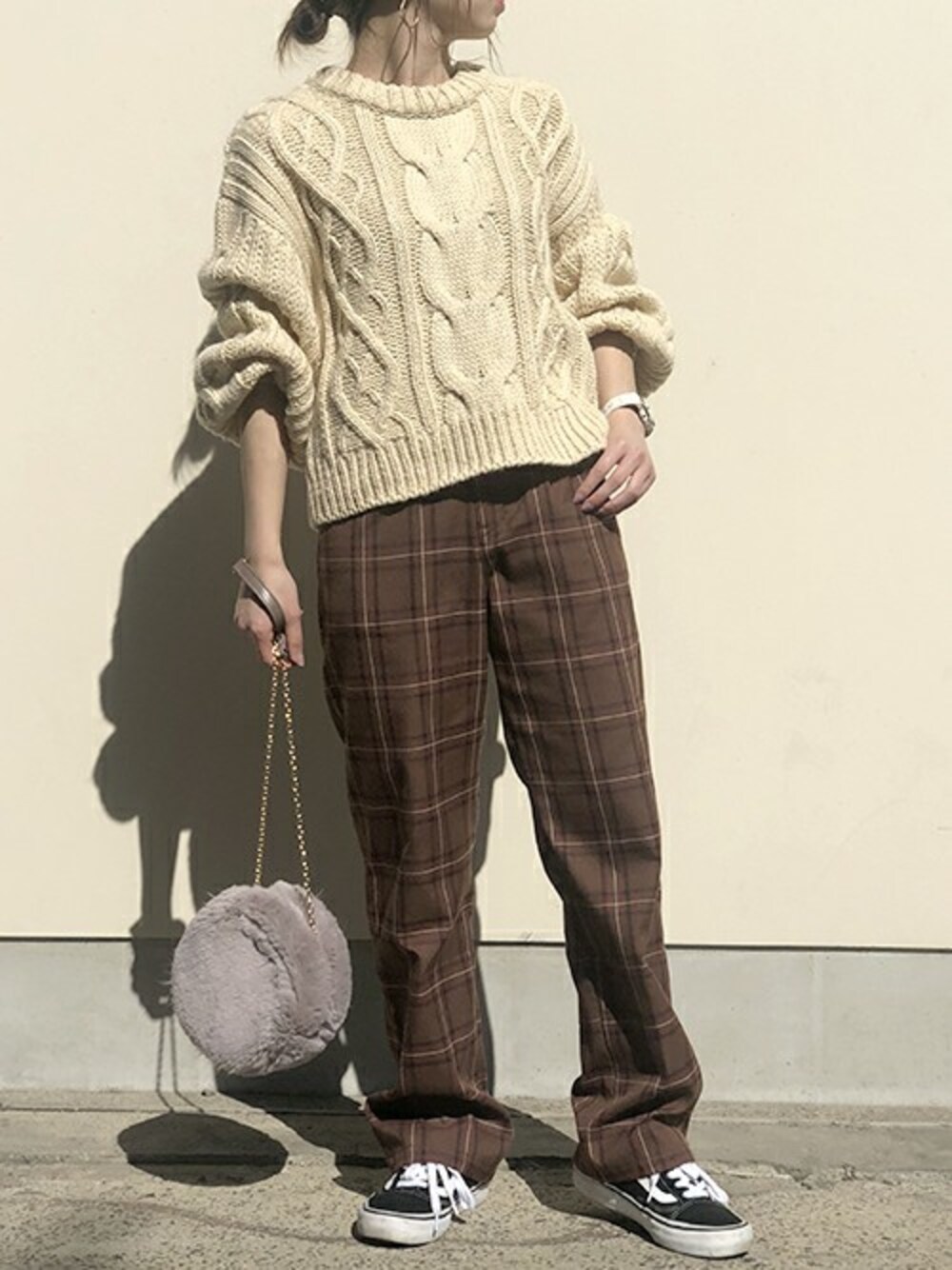 本日は【ロービングケーブルニット】を使ったコーデをご紹介します! ケーブル編みがかわいらしいこの秋持っていて損はないアイテム♪ ボリューム感のあるシルエットも魅力的◎ ショート丈なのでロングボトムスとの相性抜群です★ 今回はDISPARKのストレートパンツと合わせシンプルコーデに◎ チェック柄が季節感を演出してくれます♪ ケーブルニットは幅広いスタイルに合わせられるオススメアイテムです★ ぜひ、この機会にチェックしてみて下さい!