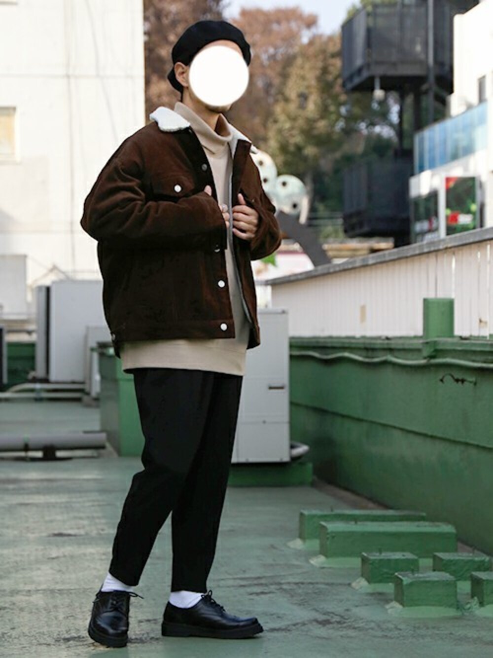 今回は季節感のある太畝のコーデュロイ素材を使用した、「ボアコーデュロイビッグGジャン」を使ったコーディネートのご紹介です! 少し野暮ったい印象のブルゾンなので、インナーにはタートルネック、ボトムスにはペグトップスラックスを合わせてカジュアルになり過ぎない印象に◎ 全体をキレイ目なアイテムで揃えた中に1点、カジュアルなアイテムを取り入れるとお洒落に決まるのでオススメですよ(^_^)