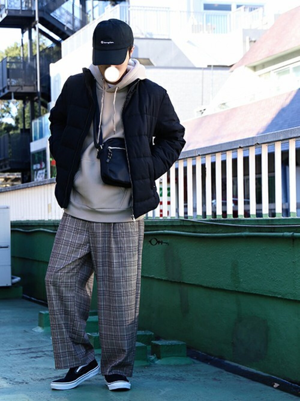 ブルゾンをつかったストリートコーデ。全体的にゆとりのあるシルエットに仕上げています。 ブラック×ブラウンをベースに着こなし、パンツはチェックをチョイス。アクセントにしました! 皆さんもこの機会にぜひチェックされてみてください◎