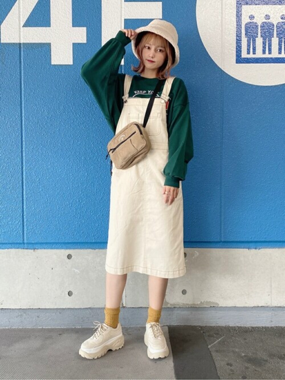 ■Instagram @simi_chin_ ミドル丈のジャンパースカートで古着ライクなコーデ♡ ベージュやオフホワイトとグリーンの組み合わせはめちゃくちゃオススメです♡ ボアバケットハットはリバーシブルで使えてどちらでかぶっても可愛いです☺︎ ★毎月5のつく日は「10%OFF」 WEGO ZOZOTOWN限定★ 気になったアイテムはぜひお気に入り登録を♪
