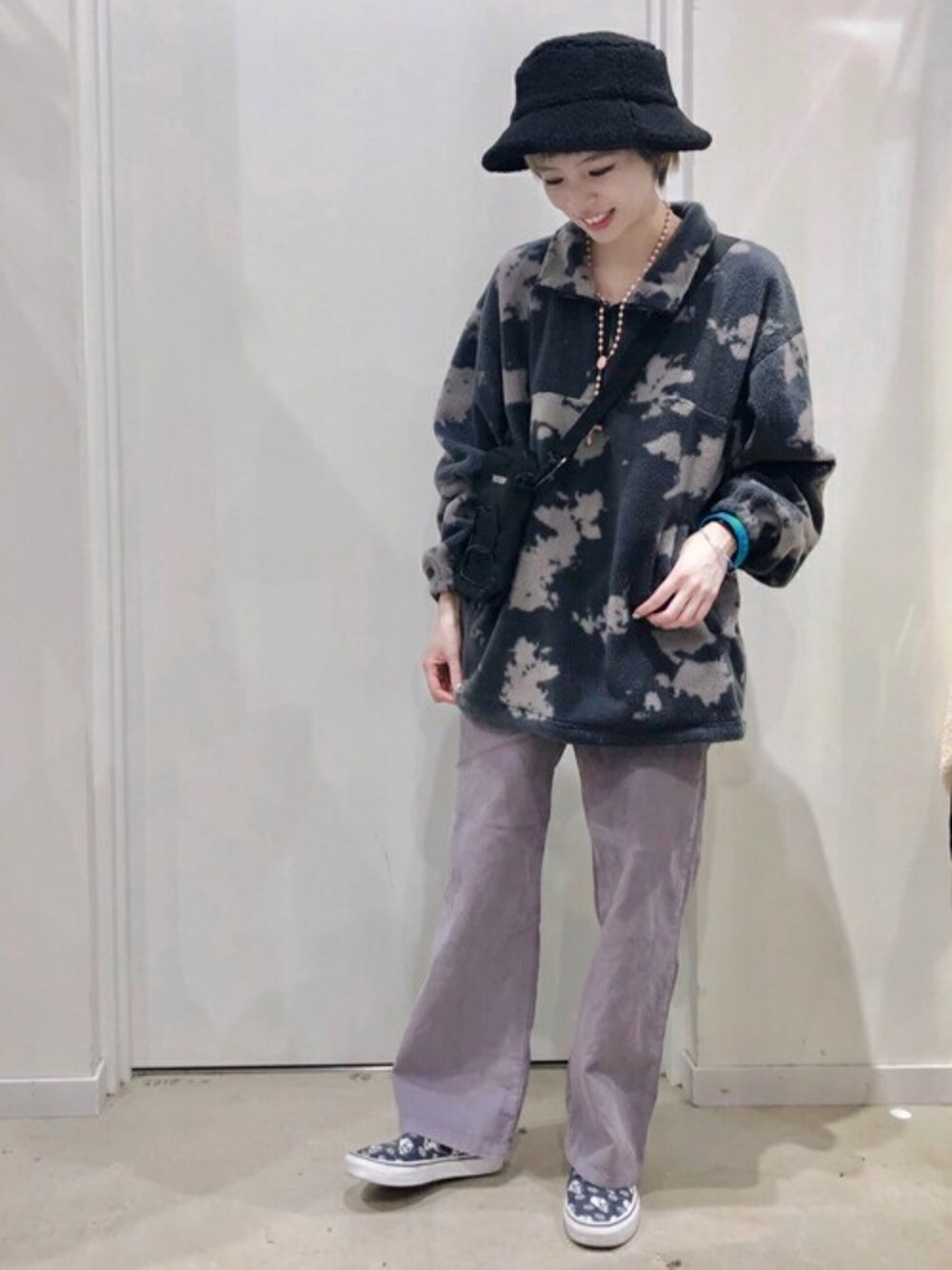 パープル×ブラックでまとめたカジュアルストリートコーデです^_^ タイダイ柄のアノラックパーカーはボア素材で暖かいし、中にプルパーカーやタートルニットなど重ね着もできる優れものです☆ ■Instagram @inakkumakuma