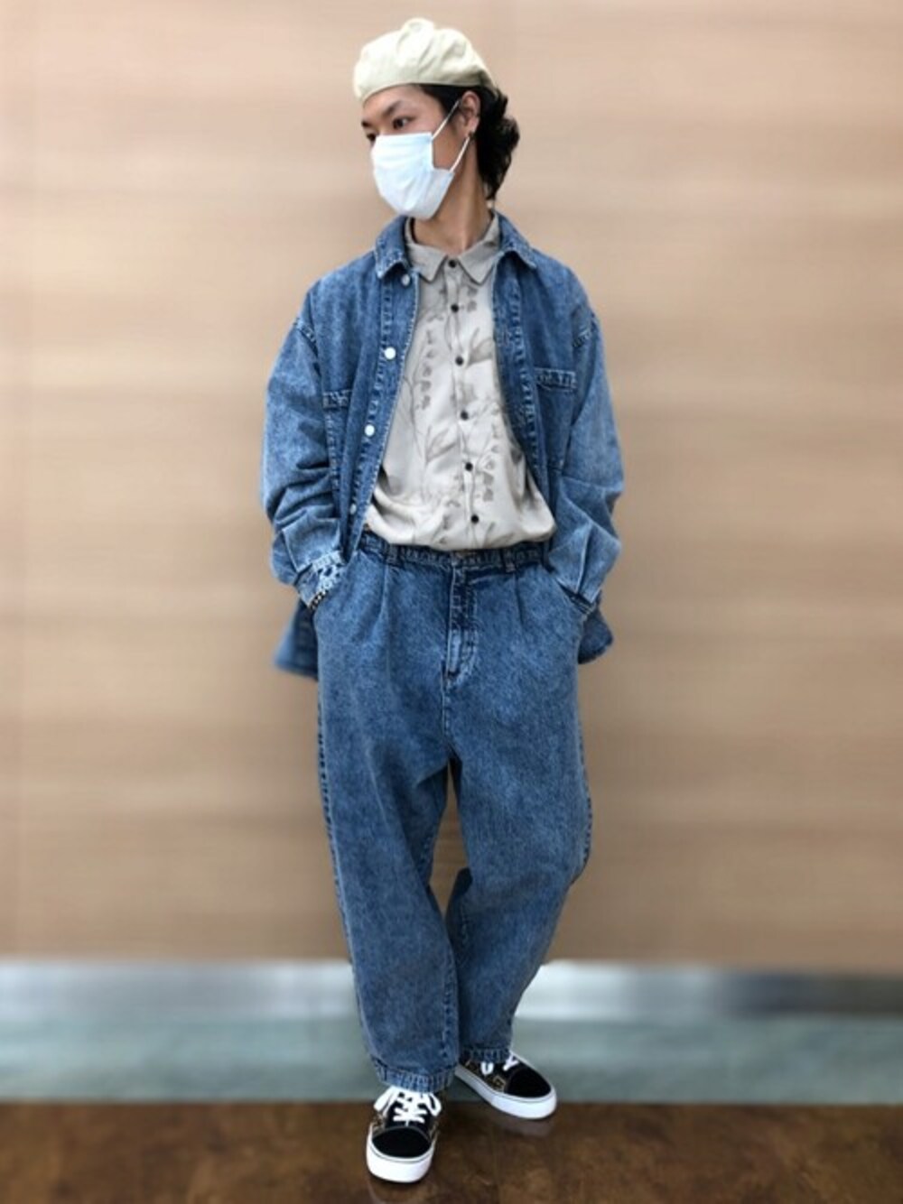 ケミカルウォッシュデニムのセットアップコーデです! 柄シャツと合わせて古着っぽい雰囲気に仕上げました! 他のアイテムの色味を統一すればセットアップを上手く着こなせますよ!