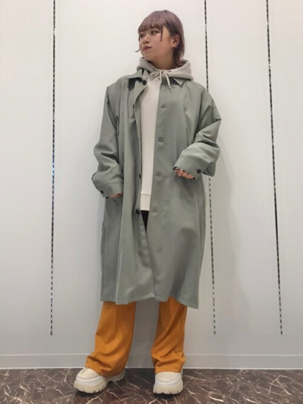【2021春夏新作】 アーバンカラーのステンカラーコートが主役のコーデ。 トップスとアウターが淡いカラーなのでパンツはビビッドなオレンジでアクセントに...( ¨̮ ) ★毎月5のつく日は「10%OFF」WEGOZOZOTOWN限定★ 気になったアイテムはぜひお気に入り登録を♪