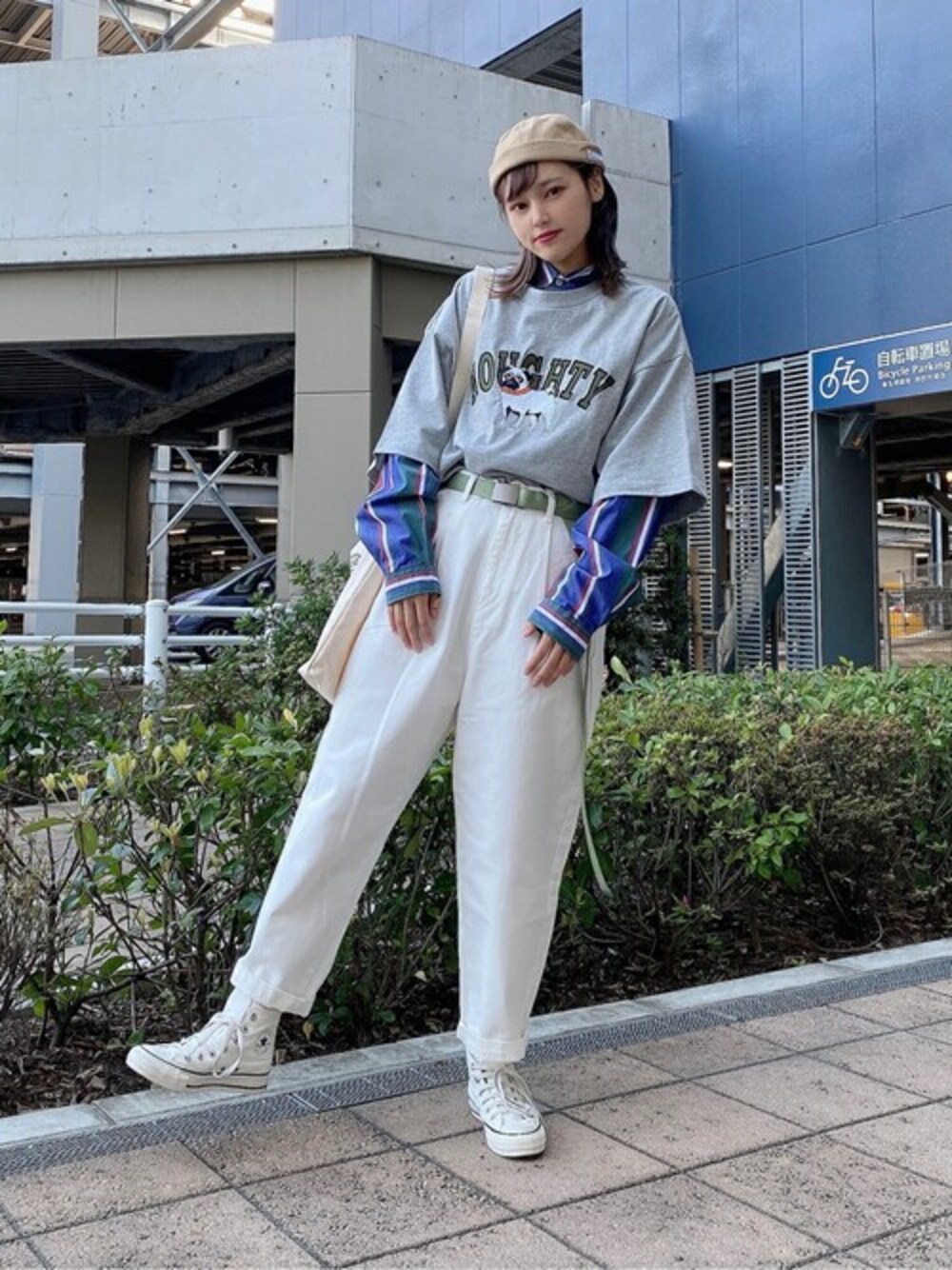 【2021春夏新作】 古着女子コーデ! グレーTシャツ×ストライプシャツ×ホワイトボトムは絶対的に可愛い! バルーンパンツは女性はSサイズがオススメ。 ガチャベルトをTシャツのロゴとシャツのストライプのグリーンで合わせて統一感を出しました。 ★毎月5のつく日は「10%OFF」WEGOZOZOTOWN限定★ 気になったアイテムはぜひお気に入り登録を♪