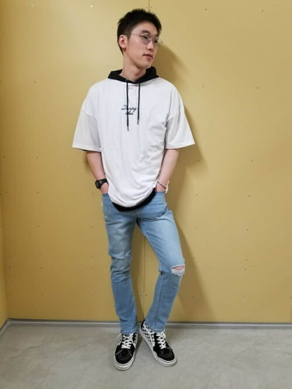WEGO(WEGO STAFF)のパーカー「WEGO/ストレートラインレイヤード半袖プルパーカー」を使ったコーディネート