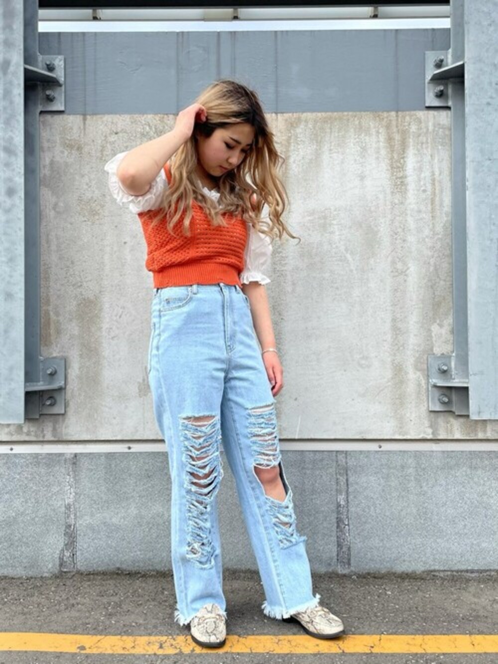 WEGO(WEGO STAFF)のデニムパンツ「WEGO/クラッシュデニムストレートパンツ」を使ったコーディネート