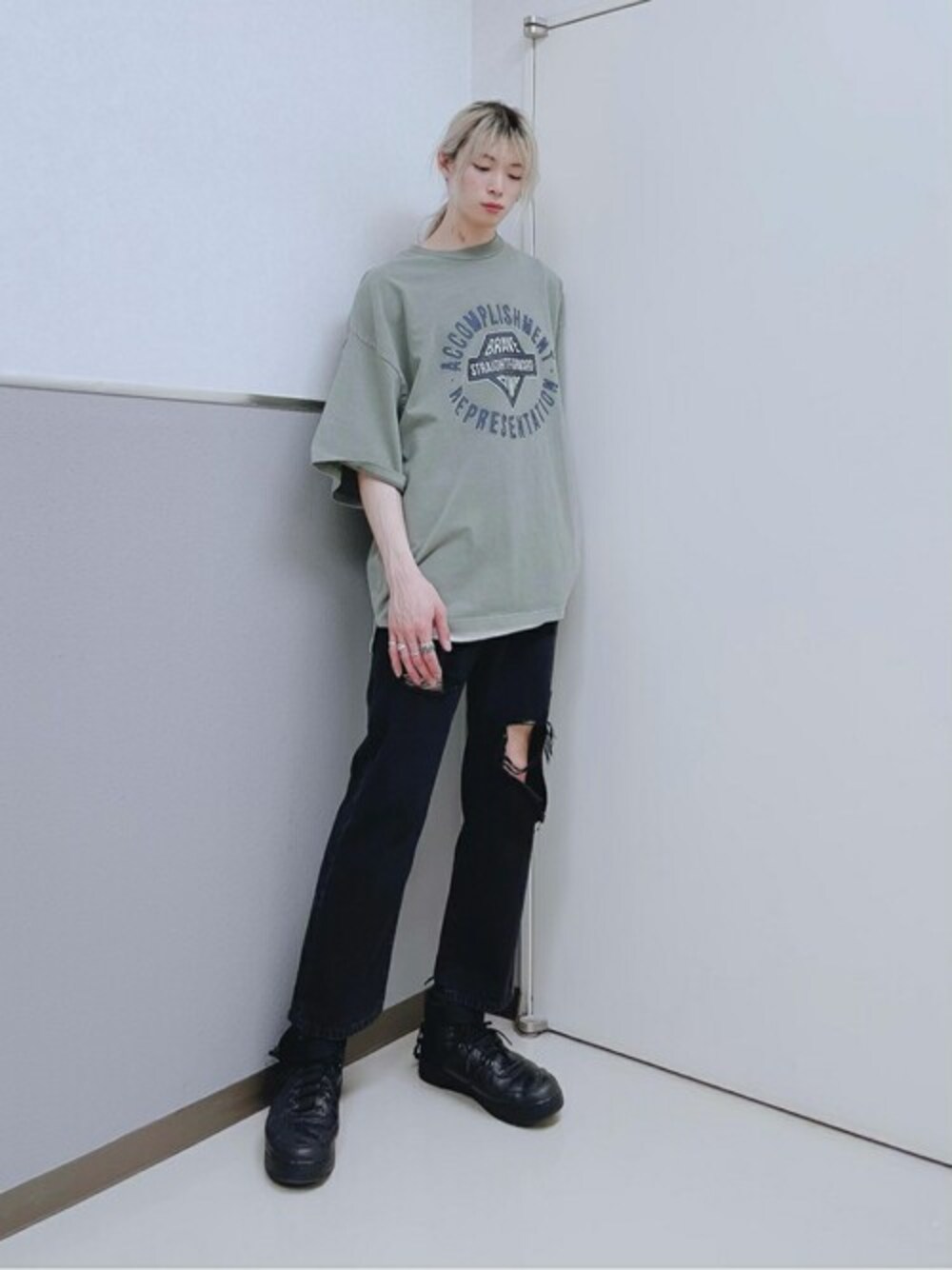 WEGO(WEGO STAFF)のデニムパンツ「WEGO/クラッシュデニムストレートパンツ」を使ったコーディネート